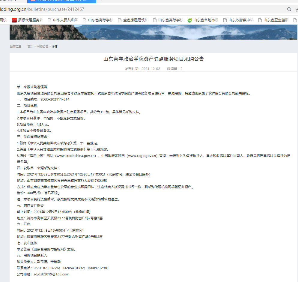 山东青年政治学院资产驻点服务项目采购公告