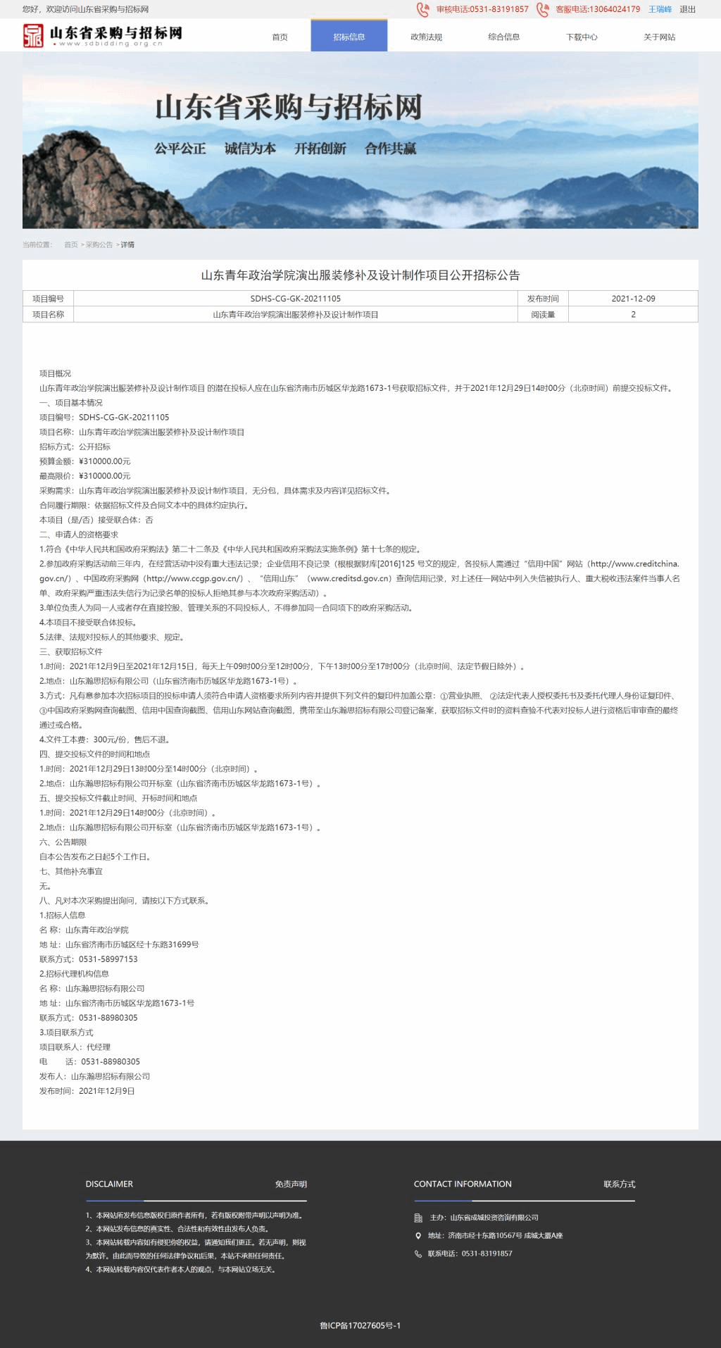 山东青年政治学院演出服装修补及设计 制作项目招标公告