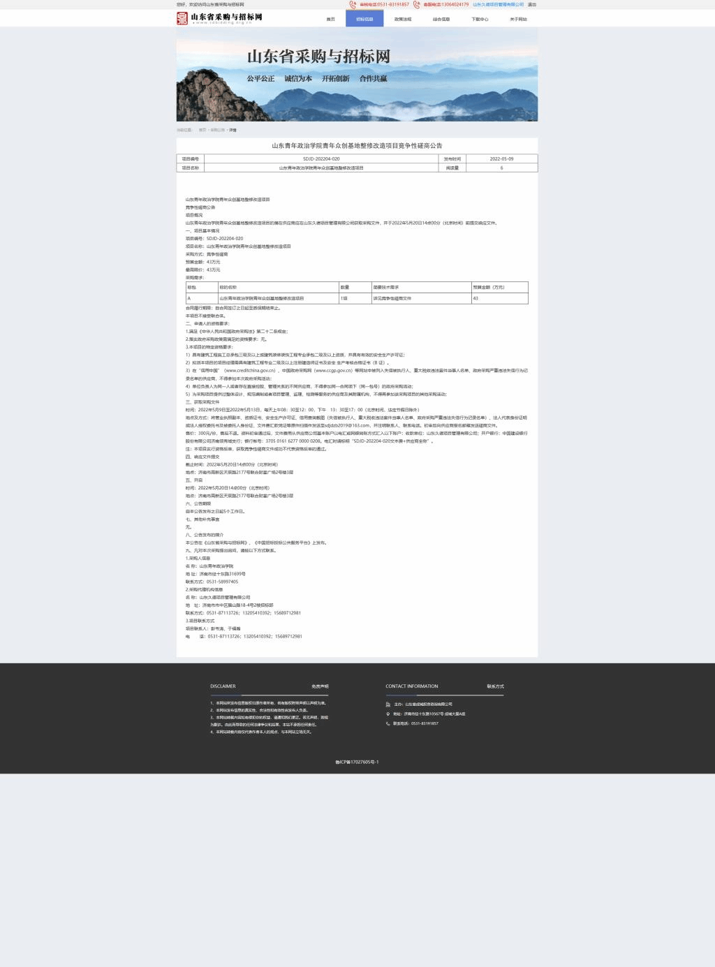 山东青年政治学院青年众创基地整修改造项目竞争性磋商公告