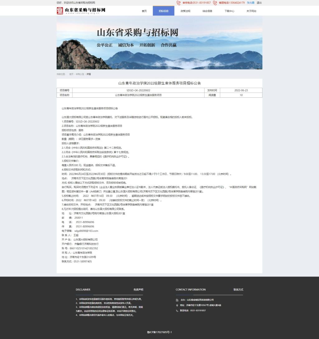 山东青年政治学院2022级新生查体服务项目公开招标公告