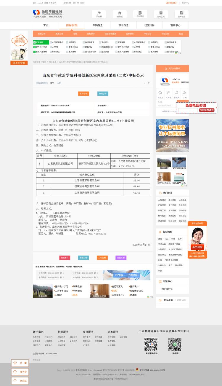 一、采购项目名称:山东青年政治学院科研创新区室内家具采购(二次)