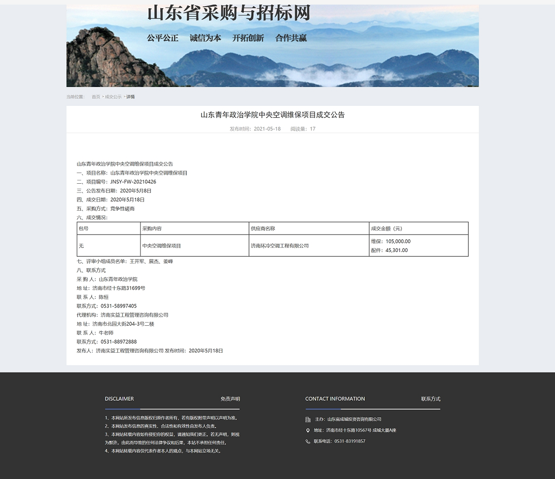 山东青年政治学院中央空调维保项目成交公告