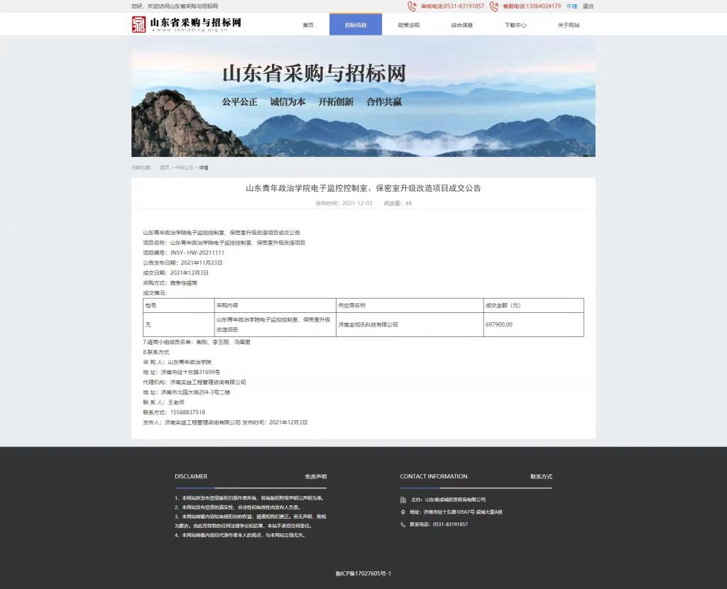 山东青年政治学院电子监控控制室、保密室升级改造项目成交公告