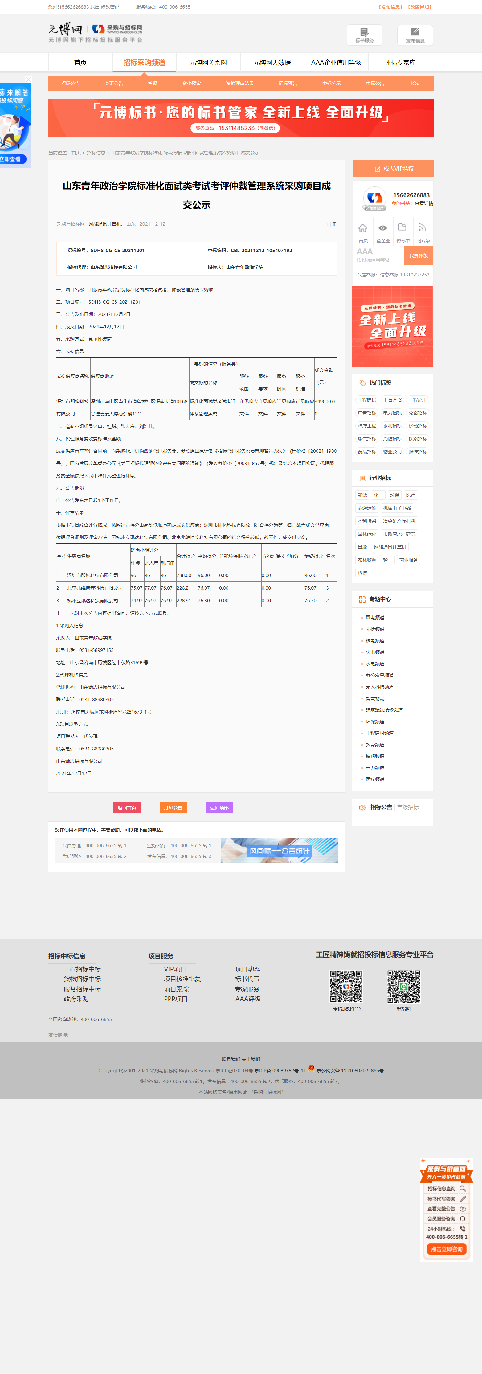 山东青年政治学院标准化面试类考试考评仲裁管理系统采购项目成交公示