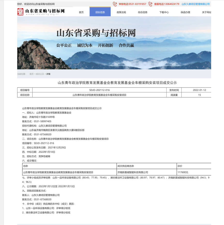 山东青年政治学院教育发展基金会教育发展基金会车棚采购安装项目成交公示