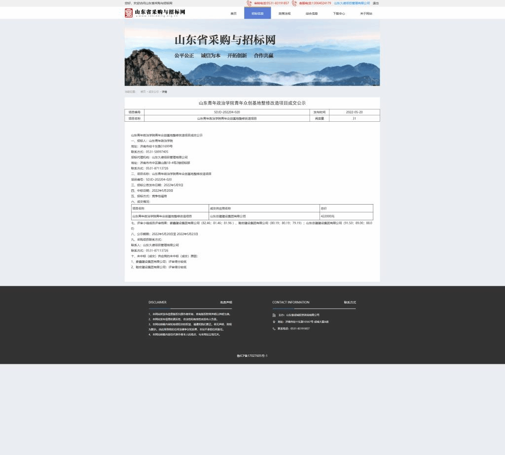 山东青年政治学院青年众创基地整修改造项目成交公示
