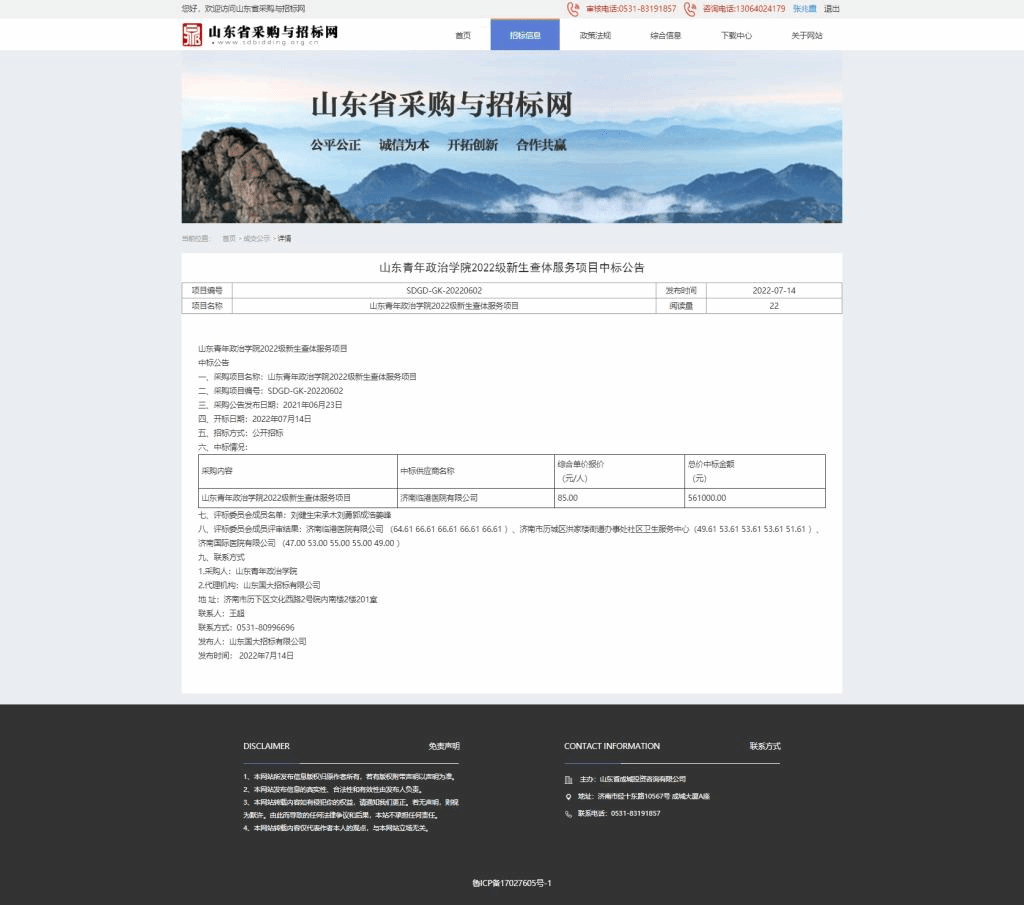 山东青年政治学院2022级新生查体服务项目中标公告